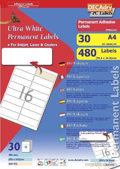 16 permanent adhesive labels on an A4 sheet